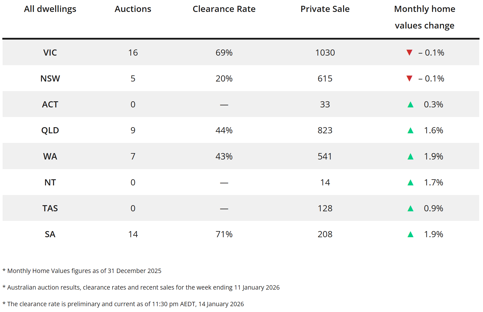 * The clearance rate is preliminary and current as of 11:30 pm AEDT, 14 January 2026